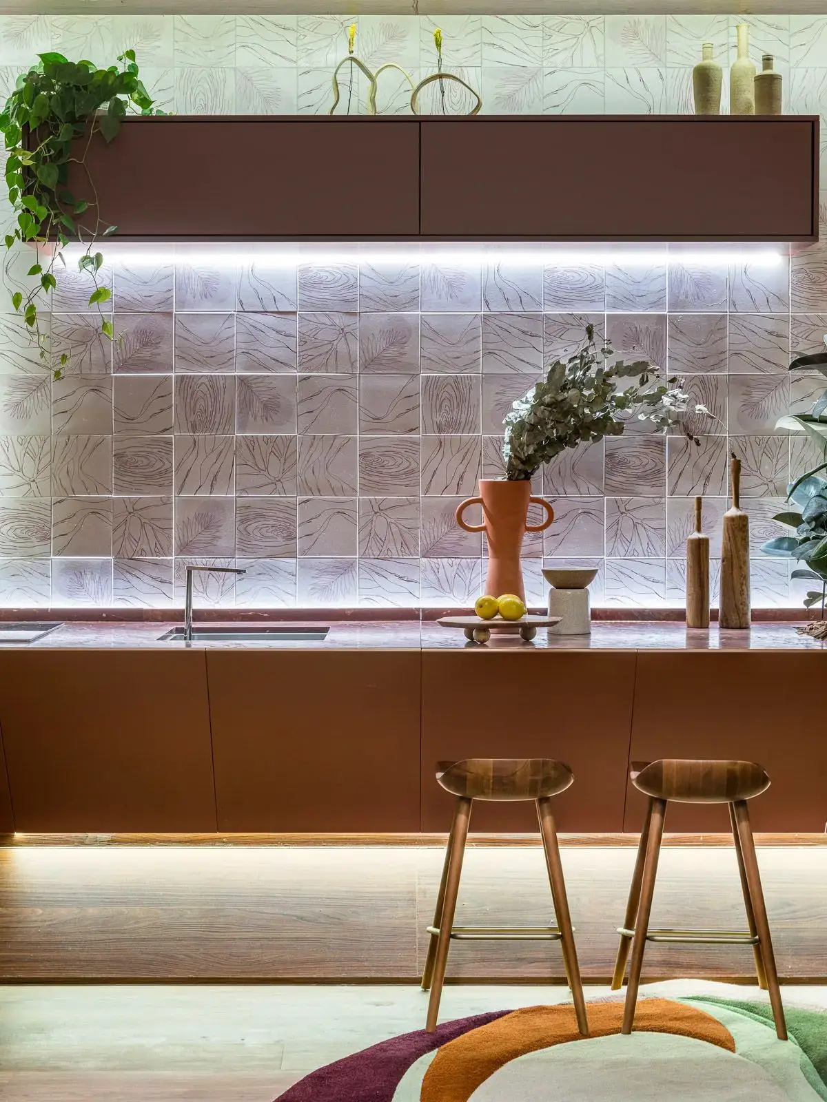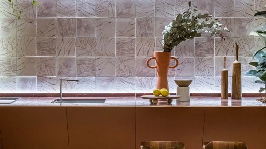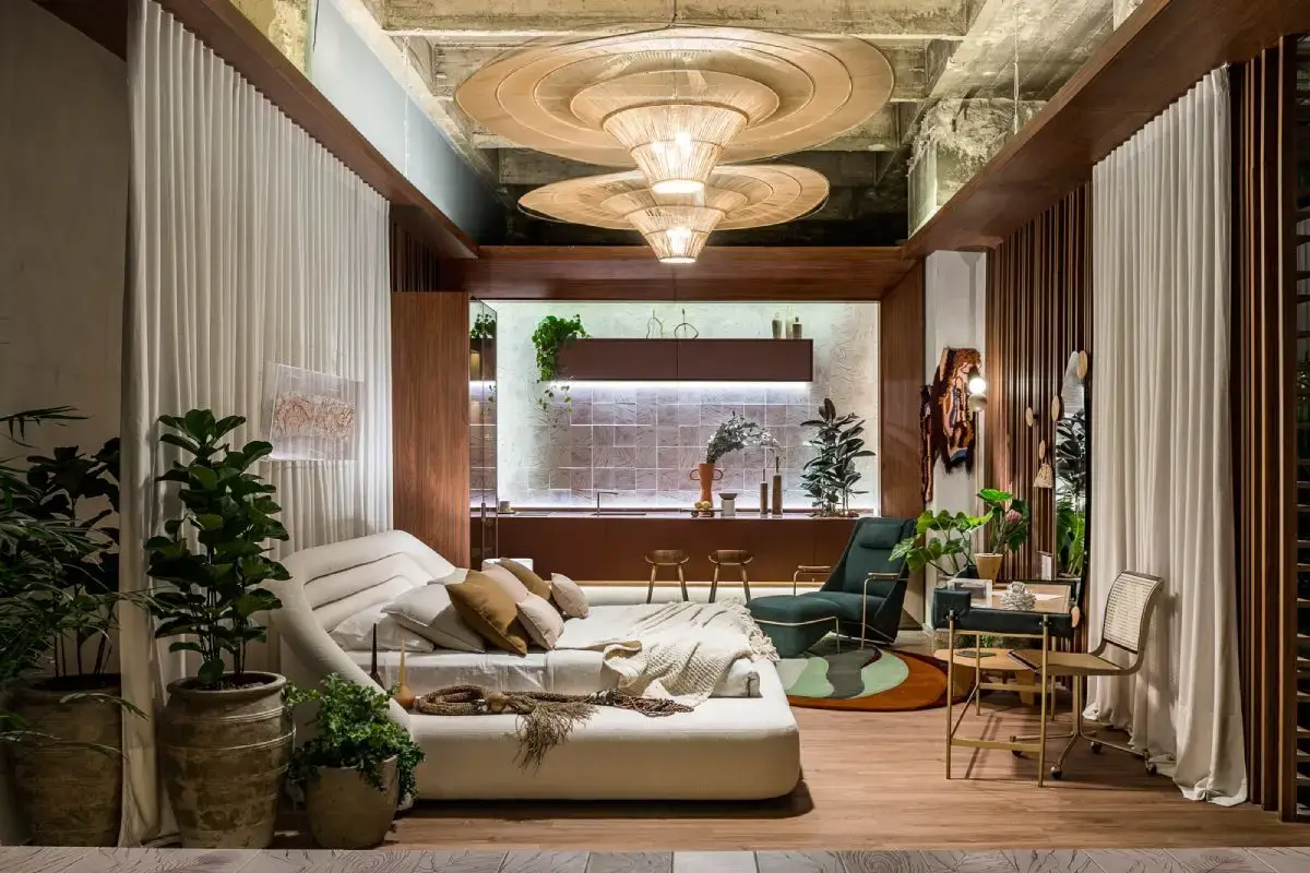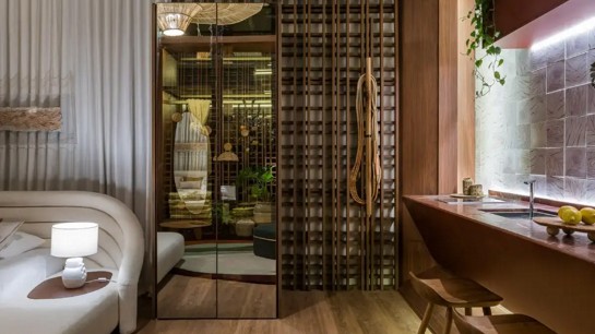 A marca foi responsável pelo desenvolvimento de todo o ambiente planejado deste estúdio elegante e refinado de 40m². Nomeado como "Espelho da Alma", o projeto foi pensado para se desconectar do mundo e se conectar consigo mesmo, como uma verdadeira janela da alma, ideal para os momentos de descanso e descanso. Para despertar os sentidos de acolhimento e bem-estar, a arquiteta escolheu uma paleta de cores em tons de marrom, marsala e terracota em contraste com tons claros de beges e verdes.