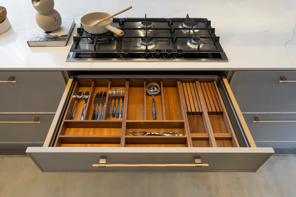 1. Cozinha de Praia: imagine uma cozinha onde todos os utensílios, louças e alimentos têm seu lugar, mesmo em um espaço limitado. Com soluções como gavetas deslizantes, prateleiras retráteis e armários aéreos, a cozinha se torna um espaço de fácil manuseio e extremamente organizado.