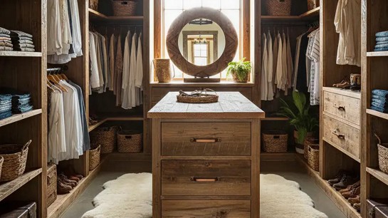O closet rústico traz referências naturais e acolhedoras. Tons amadeirados, texturas aparentes e materiais com aspecto mais orgânico criam atmosfera de conforto e proximidade.