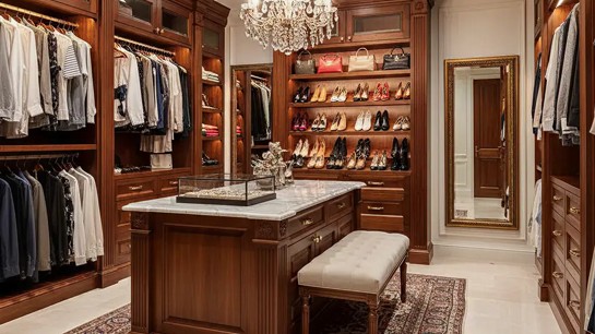 O closet clássico valoriza proporção, simetria e acabamentos atemporais. É comum o uso de cores claras, detalhes discretos e uma organização visual equilibrada, que transmite elegância e sofisticação.