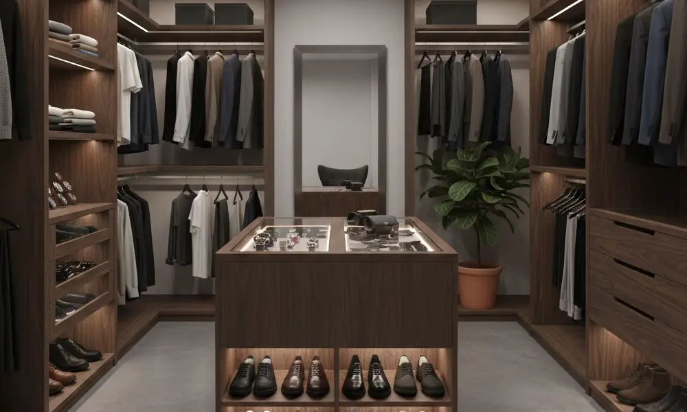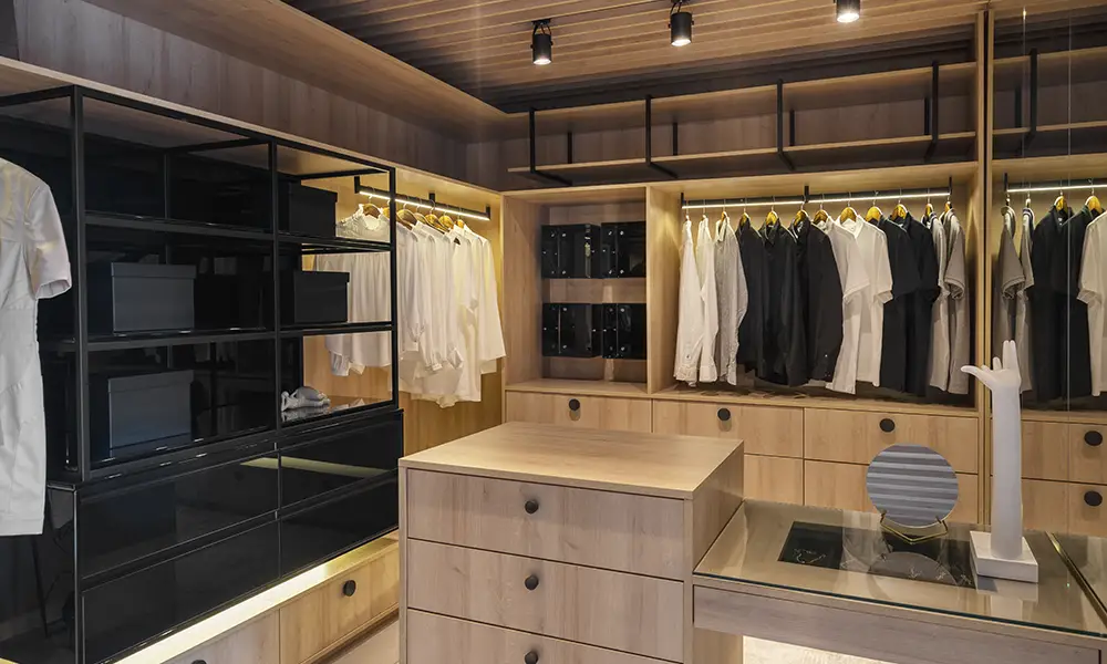 Já o closet masculino tende a priorizar cabideiros contínuos e bem dimensionados, com compartimentos específicos para camisas, calças, blazers e peças dobradas. Gavetas para cintos, gravatas, relógios e carteiras são frequentes, assim como uma organização mais direta e de fácil manutenção.