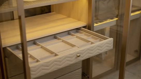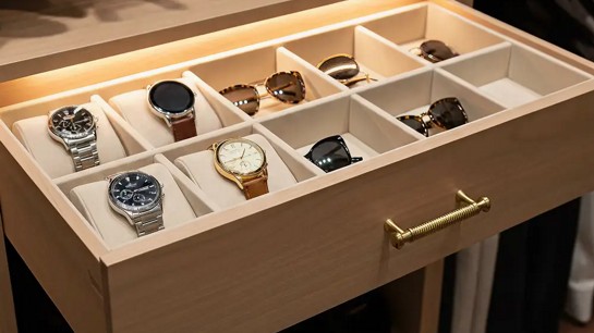 As divisórias internas complementam as gavetas, criando compartimentos específicos para cintos, lenços, relógios, óculos e outros acessórios menores. Essa setorização evita misturas, reduz o desgaste das peças e torna a rotina mais prática.