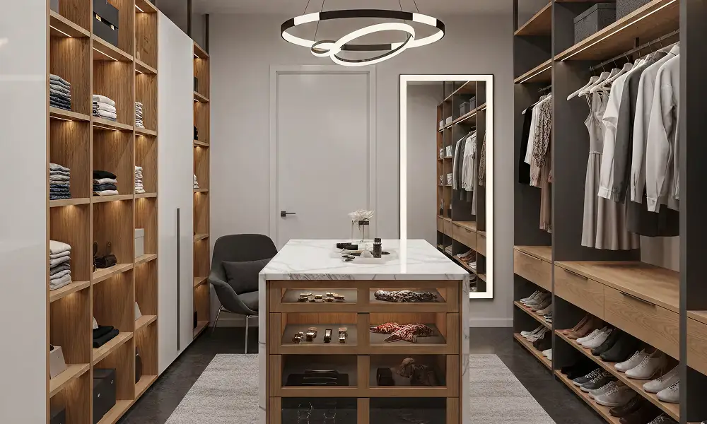 Quando integrada a prateleiras, gavetas e cabideiros, a iluminação elimina sombras internas e melhora significativamente a experiência de uso. Em projetos residenciais, costuma-se trabalhar com temperaturas de cor entre 3000K e 4000K, equilibrando conforto e fidelidade das cores das roupas.
