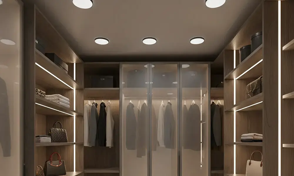 A iluminação embutida é um dos acessórios mais importantes do closet. Além de facilitar a visualização das peças, ela contribui para o conforto visual e para a percepção de organização do espaço.