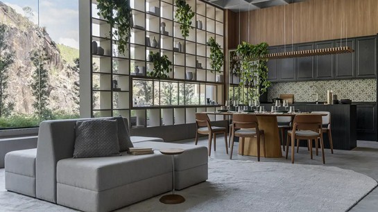 Esse movimento dialoga com conceitos como o design biofílico e com a consolidação do chamado Slow Living, que valoriza ambientes mais calmos, sensoriais e conectados ao ritmo real da vida contemporânea. Dentro dessa abordagem, a aplicação da biofilia torna-se mais técnica e menos literal. A escolha de materiais com textura orgânica, como lâminas naturais de madeira ou padrões que reproduzem veios com fidelidade tátil, contribui para uma percepção mais acolhedora do espaço. Entretanto, a sofisticação está na dosagem: o uso desses materiais precisa dialogar com proporções, iluminação e volumetria para que o resultado não se torne excessivo ou datado.